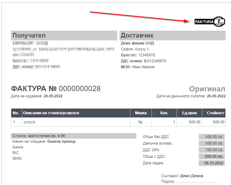 Логото ще бъде оразмерено до размер 140x80 px, за да изглежда добре логото върху фактурите Ви, препоръчваме да предоставите лого на бял фон с точен размер 140x80 px.