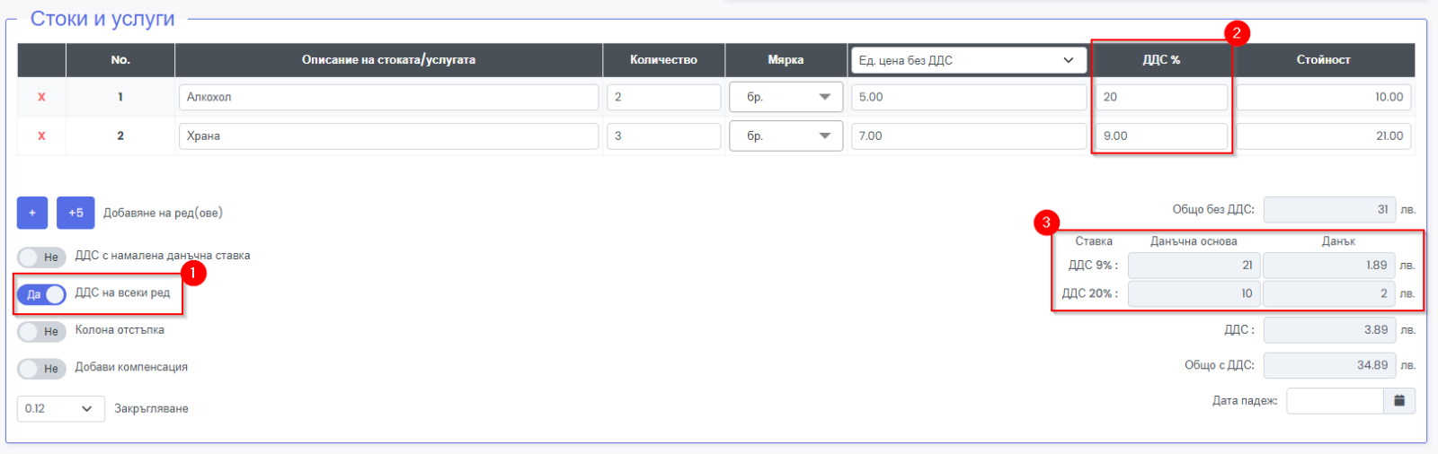 След активирането на опцията ще имате нова колона ДДС % (2), в която можете да въведете различни ДДС ставки