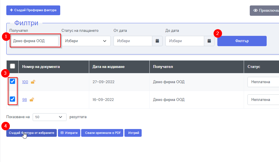 6. Кликнете на бутона: Създай фактура от избраните (4)