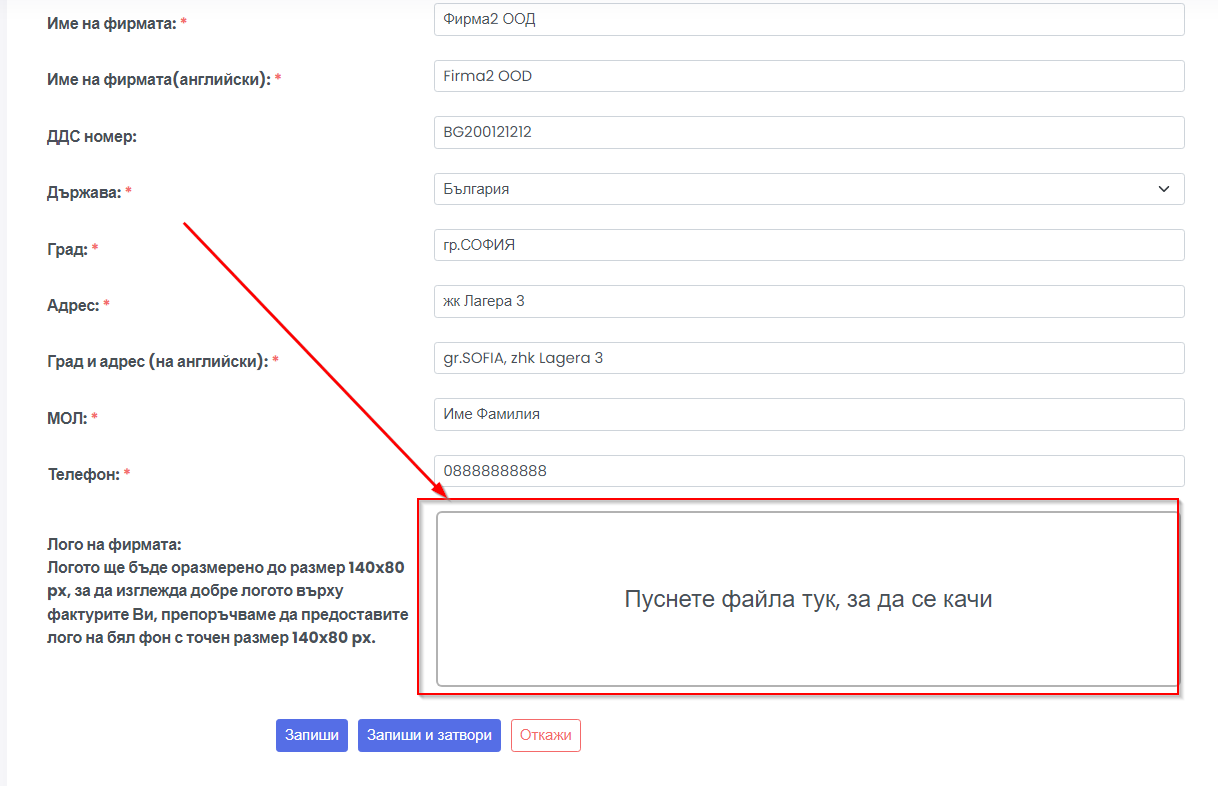 Логото ще бъде оразмерено до размер 140x80 px, за да изглежда добре логото върху фактурите Ви, препоръчваме да предоставите лого на бял фон с точен размер 140x80 px.